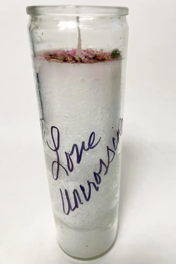 Use this candle to attract love to you. Place your petition underneath the candle & burn on a Friday night.