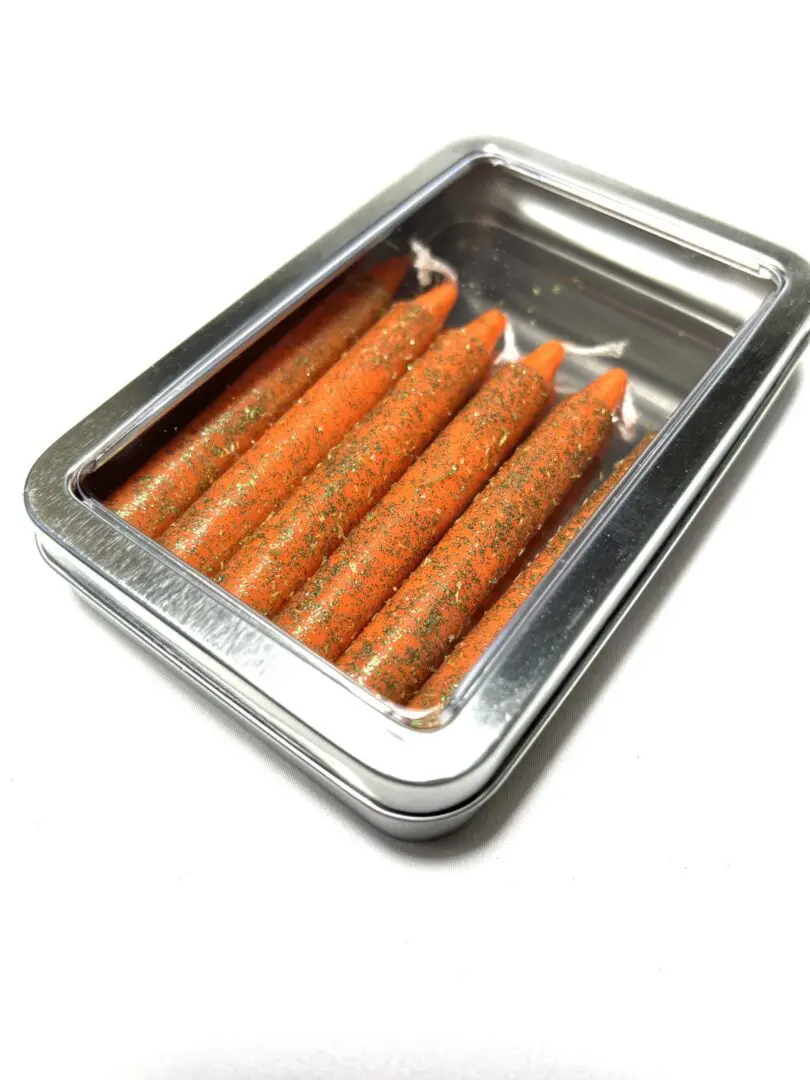 A metal container with carrots in it.
