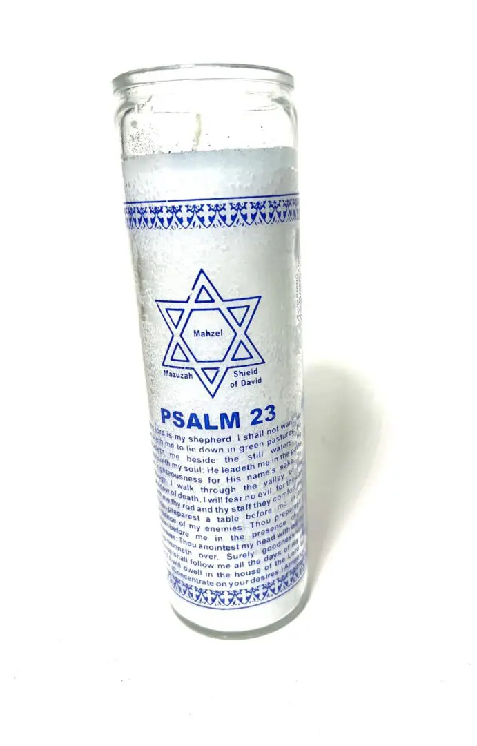 This 7 day candle is a beautiful addition to any home in need of religious guidance. The 23rd psalm is spelled out on the side with blue writing. Light this religious candle in your home to guard it, and everyone who lives there, against evil. The glow of this candle will create a soothing atmosphere ideal for meditation, reflection and prayer. With the flickering of its light, you will find yourself in a complete different state of mind as you recite the 23rd psalm. This candle will burn for 120 hours and will guard your home against negative energy for just as long.