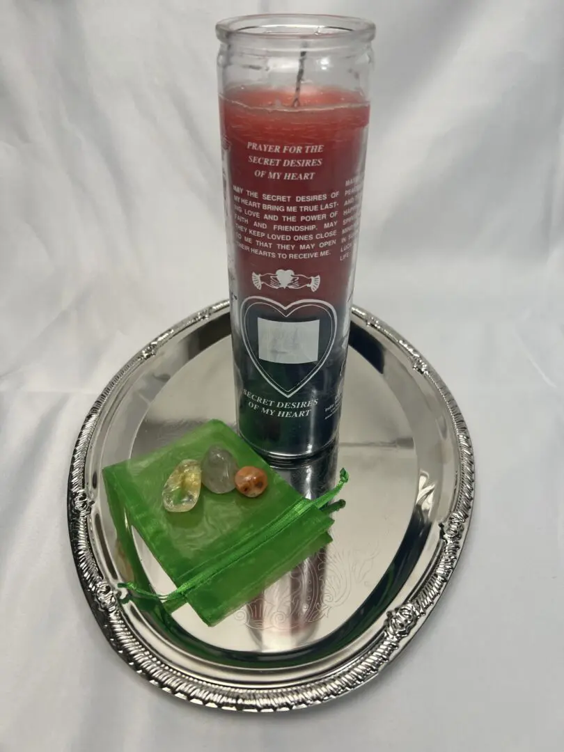 Directions: Write out your petition then place it underneath the silver tray. Place your candle on top of the silver tray & place your crystals around the candle. Start burning the candle after a new moon on a Sunday, Monday or Thursday.