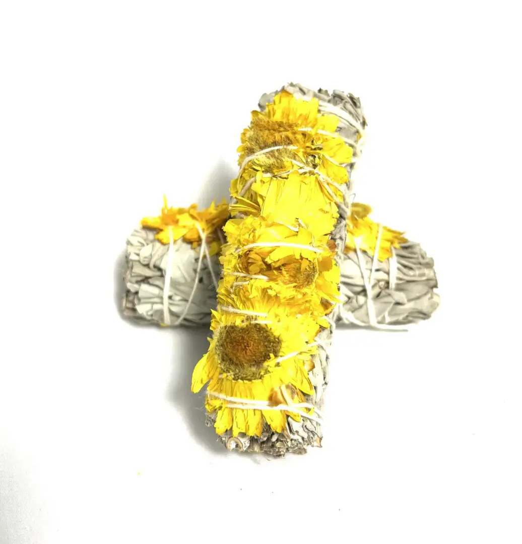 White sage is the most popular of all smudges. Use it for cleansing clearing and blessing for yourself or your space. Sunflowers bring truth, wishes, loyalty, happiness and childlike joy.